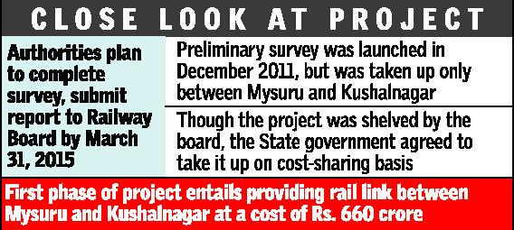 The preliminary engineering-cum-traffic survey for the railway line was launched in December 2011, but was taken up only between Mysuru and Kushalnagar and the partial survey report was submitted to the Railway Board. Though the project was shelved by the Railway Board on grounds of being commercially unviable, the State government has evinced interest in the project and has agreed to take it up on a cost-sharing basis, apart from providing land to the Railways.
