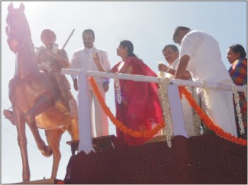 Caption: D.V. Sadananda Gowda is seen unveiling the statue of freedom fighter Guddemane Appayya Gowda in Madikeri yesterday. His wife Dotty Sadananda Gowda is seen offering floral tributes.