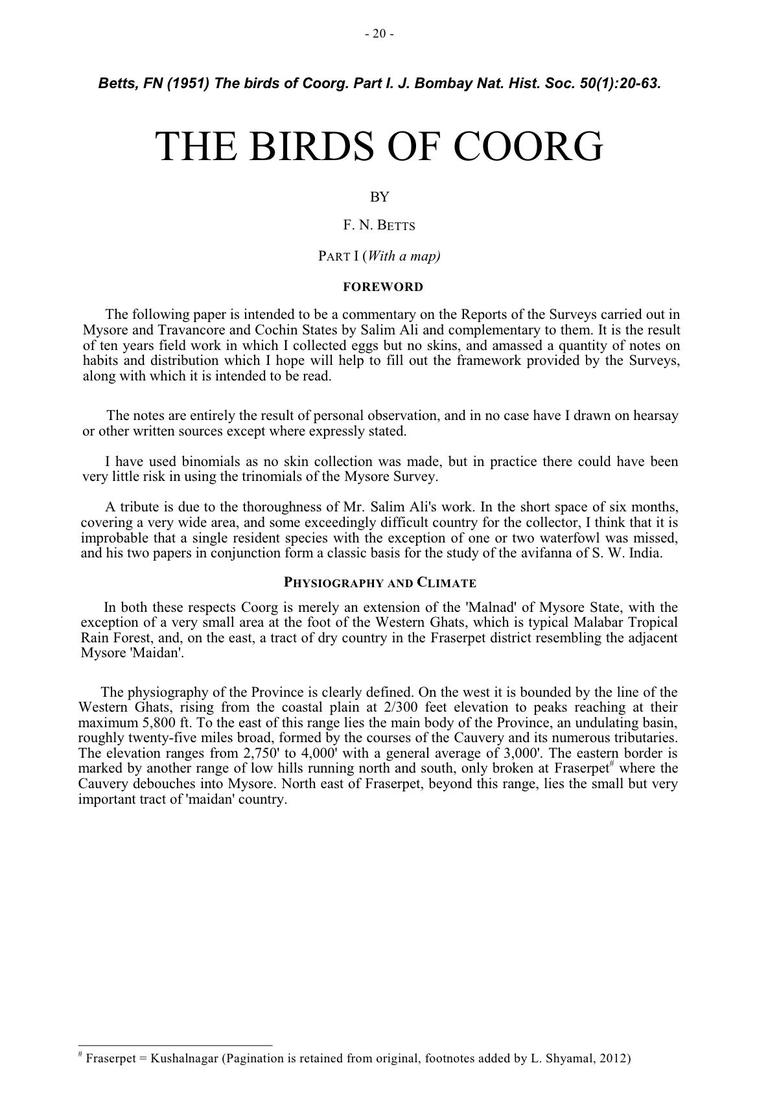 The book ” THE BIRDS OF COORG ” written by F N BETTS and published in 1951 , is available at the following link below – 85 pages