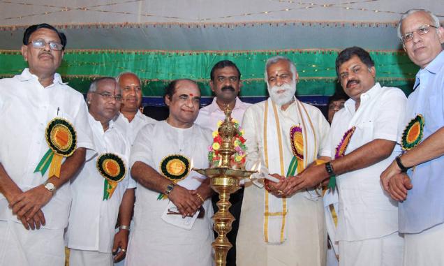 At the function: G.K.Vasan, Union minister of Shipping, (second right) and Kaumuri Bapi Raju, MP (third right), G. Rangaswamy Moopanar, president, Sri Thyagabrahma Mahotsava Sabha (left)and A.K. Palanivel at Thanjavur. Photo: B. Velankanni Raj