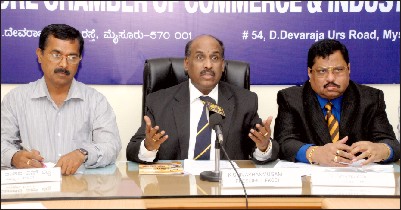 Caption: FKCCI President K. Shivashanmugam addressing a press conference at Mysore Chamber of Commerce and Industry (MCCI) premises in city this morning. He is flanked by MCCI President Sudhakar S. Shetty and FKCCI Vice-President R. Shivashankar. [Pic. by Pragathi Gopalakrishna]