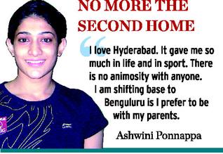 Glamour girl of Indian badminton Ashwini Ponnappa, who not long ago made Hyderabad as her ‘second home’, has decided to shift her base to Bangalore — a decision which could trigger intense speculations. However, 23-year-old Ashwini on Monday insisted that since her parents had shifted to her hometown, she too had decided to join them. “But, whenever the national camps are scheduled in Hyderabad, I will be coming here,” said Ashwini, who along with Gutta Jwala, has become the first pair from India to win a bronze medal in the World Championship last year.
