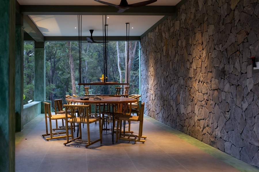 The expansive picture windows offer uninterrupted views of the lush coffee plantation and forest beyond, ensuring guests stay connected to nature at all times. The lodge’s semi-open lounge and dining areas welcome fresh air and natural light, creating a tranquil atmosphere amidst nature. Beautifully enhanced with Kodava crafts and artifacts, these spaces add a distinct local charm to the home.